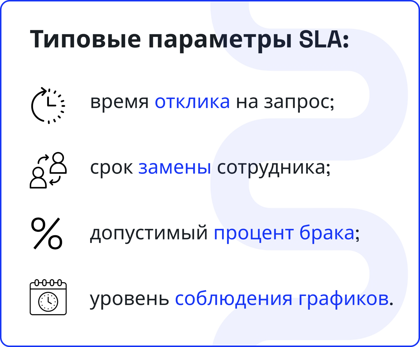 Service Level Agreement (SLA) — это формализованное соглашение об уровне сервиса. В нём фиксируются конкретные обязательства подрядчика: сроки, объемы, допустимый процент брака, скорость реакции и другие параметры.