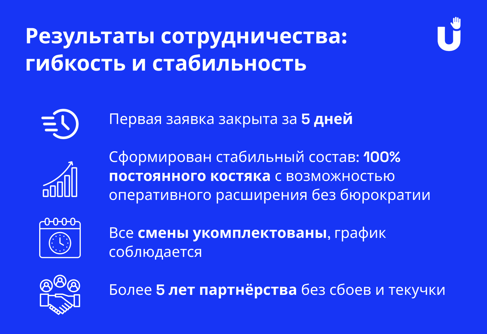 3. Устойчивый костяк без текучки. Люди закрепились, адаптированы и работают стабильно. HR-служба и руководство клиента не тратит ресурсы на текучку, замены и обучение новых.