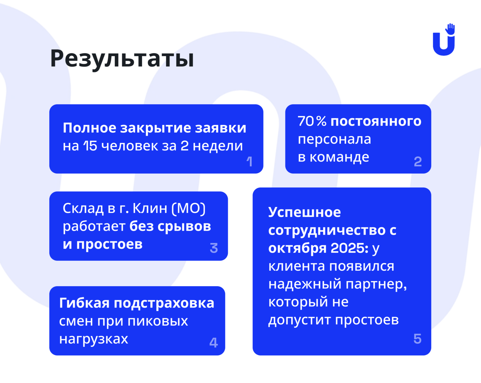 3. Постоянная подстраховка клиента. График 5/2 с возможными выходами в выходные требует оперативной реакции. За объектом закреплены менеджер и бригадир, которые всегда на связи и готовы усилить смены при необходимости. Клиенту не приходится искать людей в последний момент, ведь у них уже есть партнер, готовый вывести людей по одному звонку.